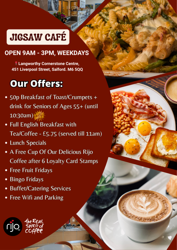 ✨ Come and enjoy freshly cooked meals, hot brews, and friendly faces at Jigsaw Café at Langworthy Cornerstone Centre, right in the heart of Salford.