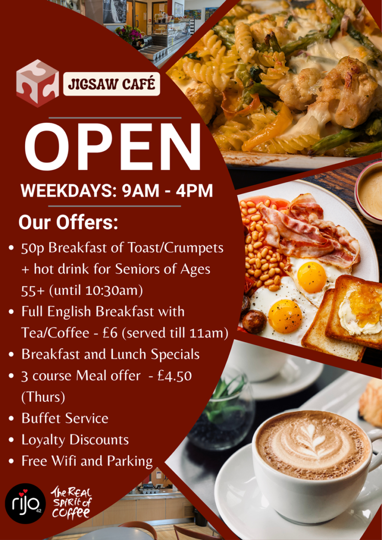 Our fabulous Jigsaw Café (formerly Chimney Pots Café) is open Monday – Friday from 9:00 am – 16:00 pm, Serving a range of low cost, healthy food.