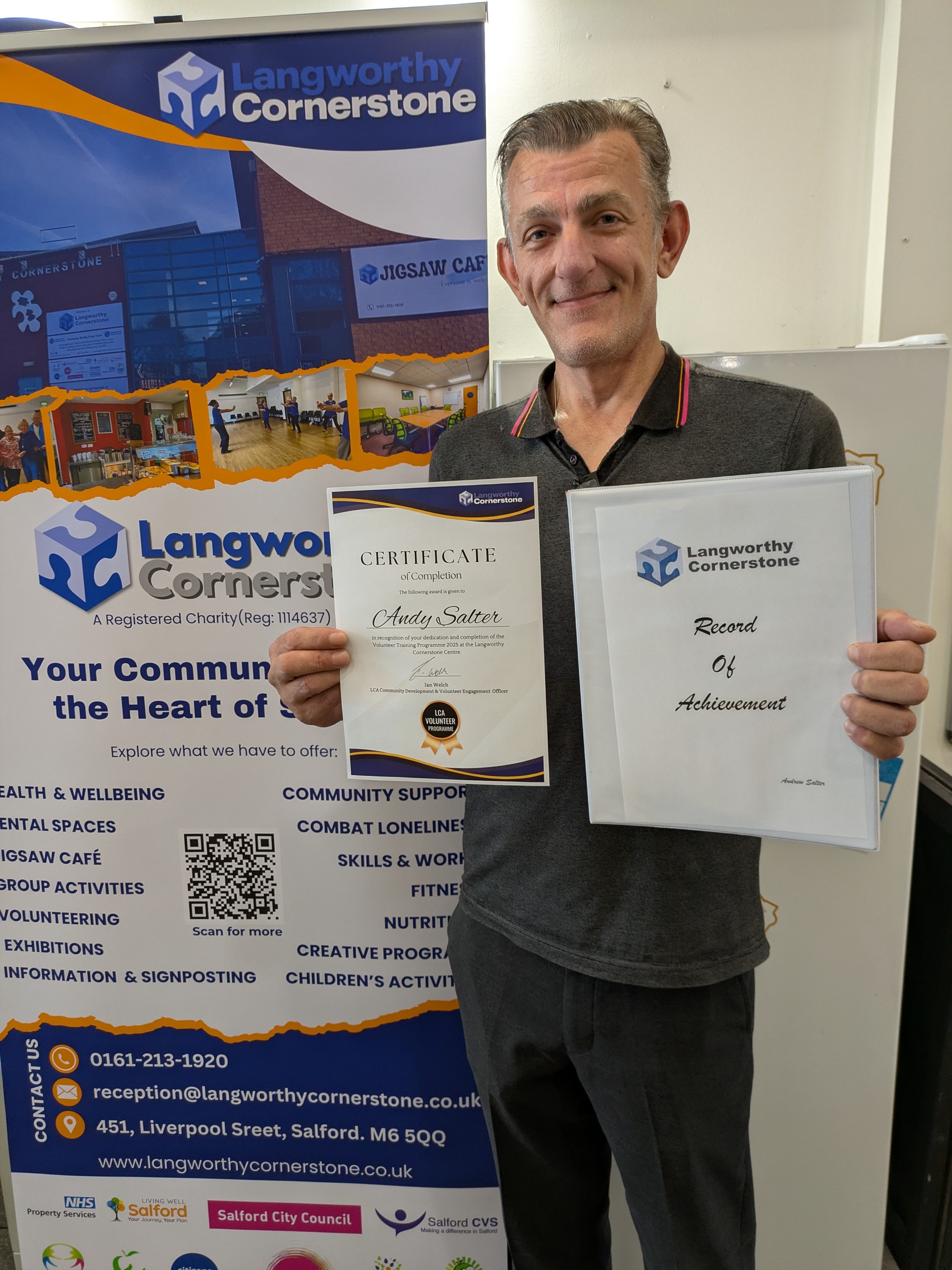 'I began volunteering at Langworthy Cornerstone in January 2023 after completing healing therapy through Survivors Manchester and support sessions with Talk About It Mate. Seeking meaningful engagement, I joined Salford Litter Heroes, initially focusing on litter picking/cleaning the area around the Centre and other Salford areas.